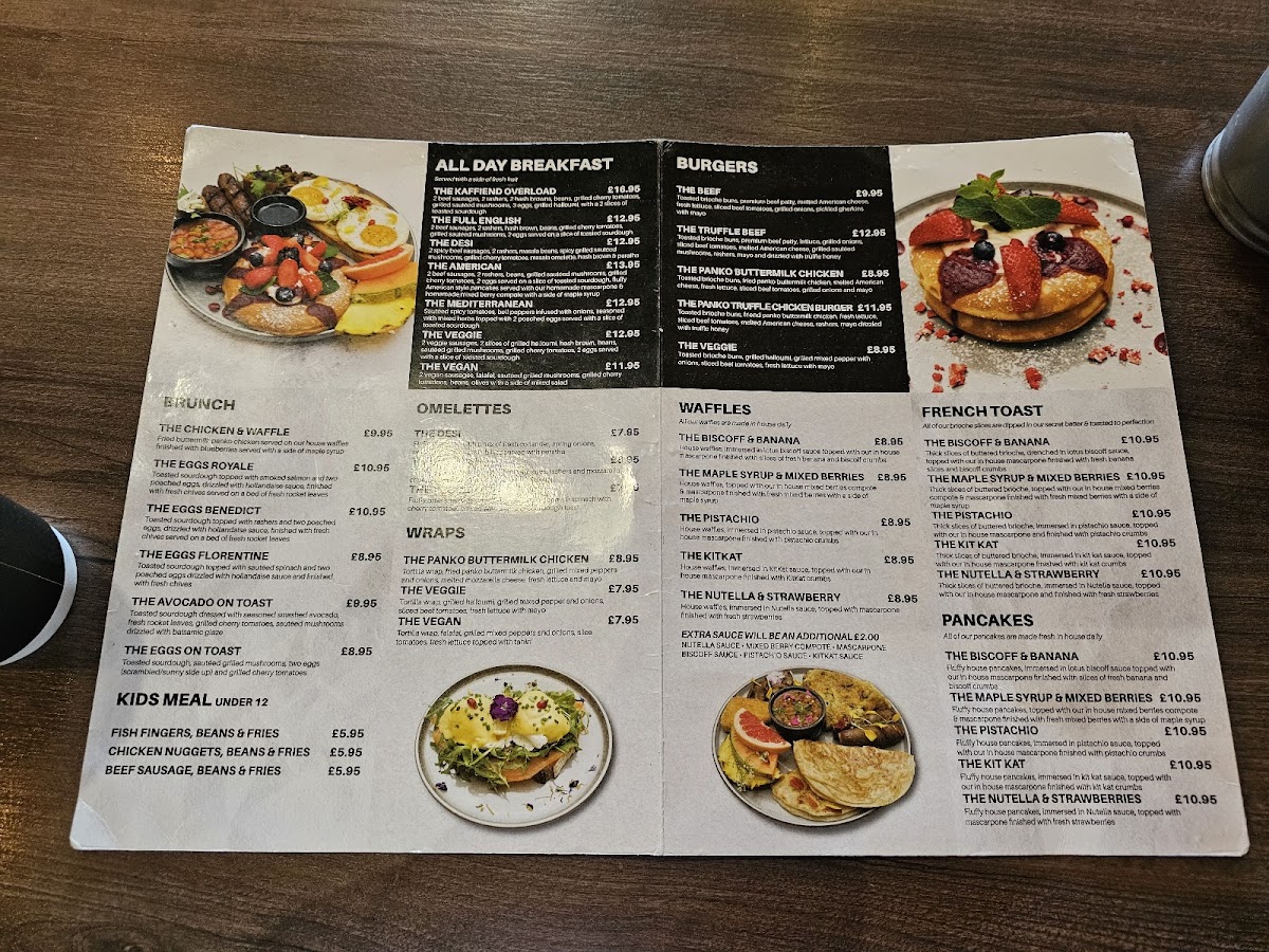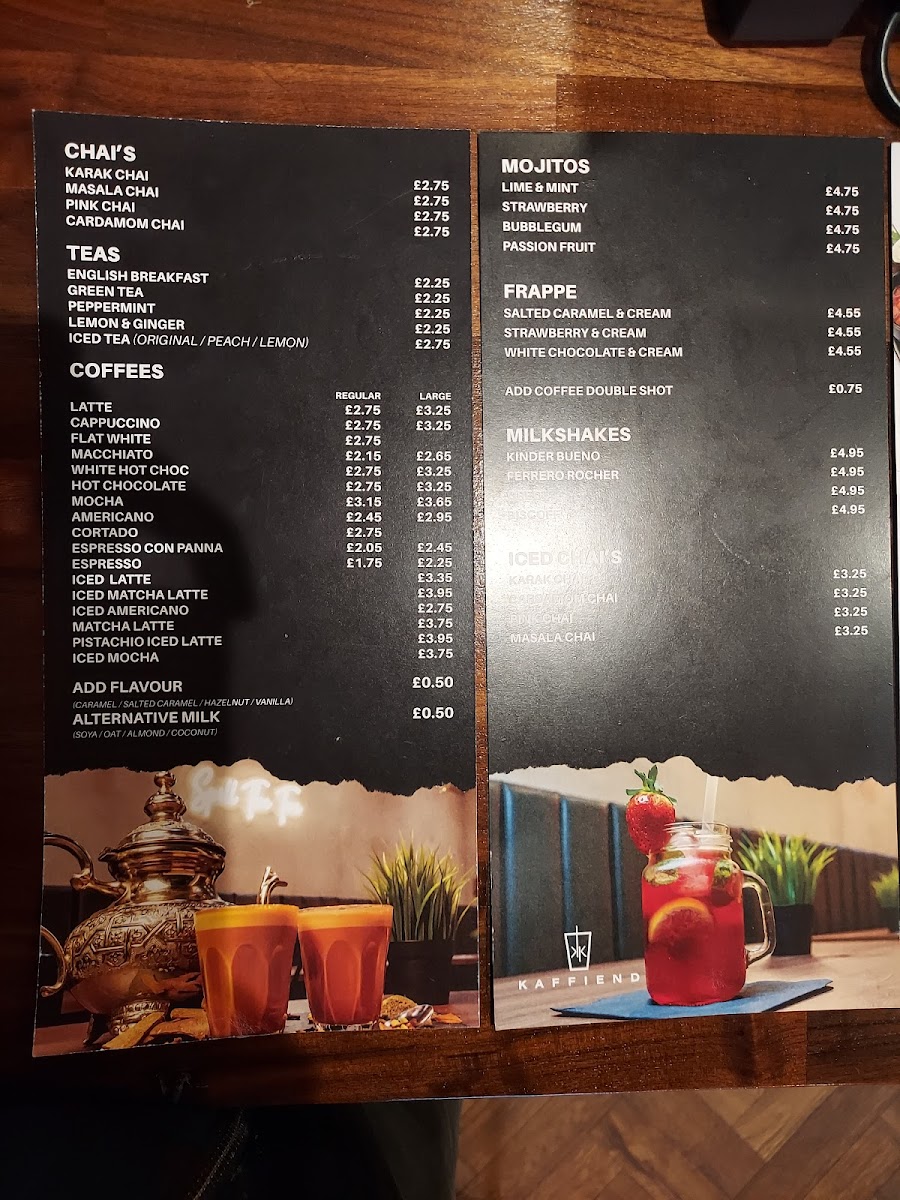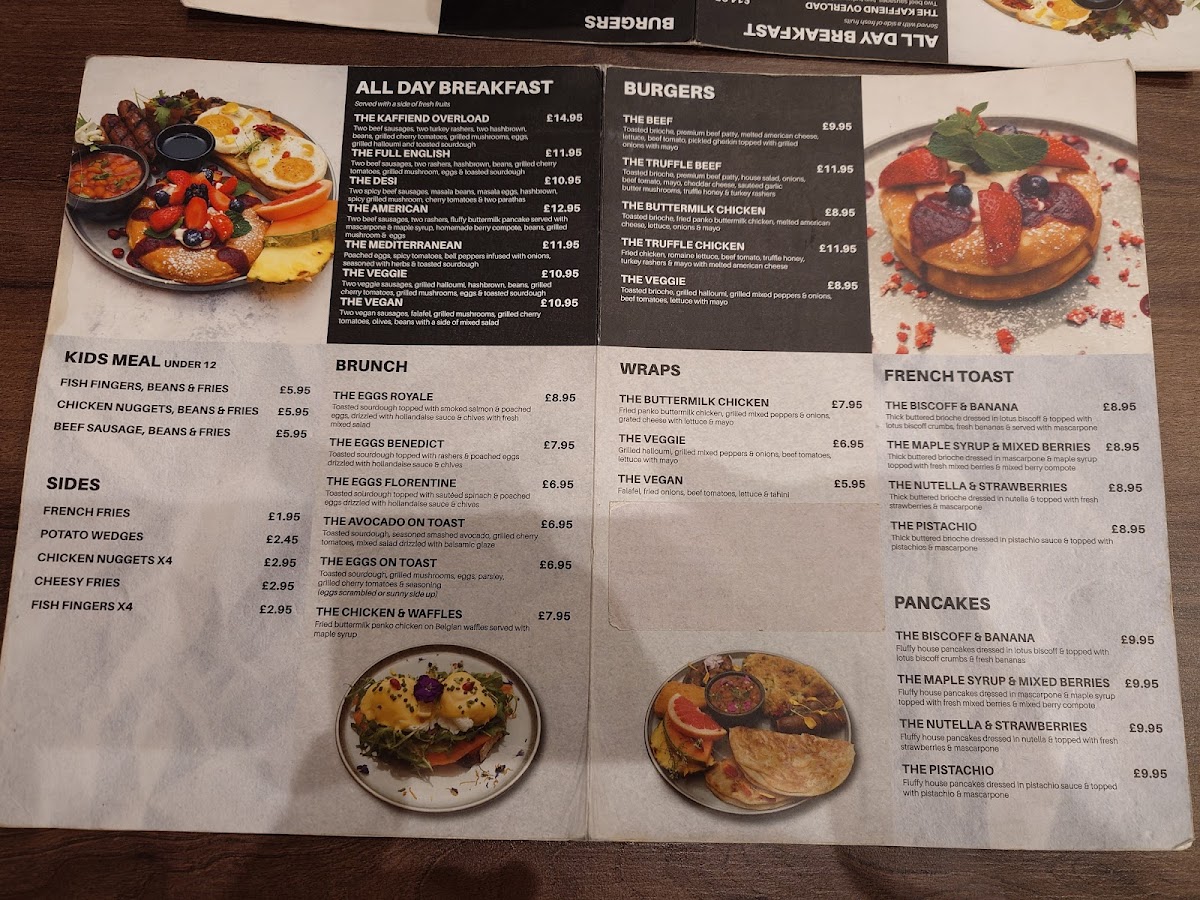 Welcome to Kaffiend, where culinary creativity meets comfort! Nestled at 394 Green St, London E13 9AP, our menu is a delightful journey through flavors that cater to every craving. Dive into our perfectly crafted English Breakfast or savor the delicate Eggs Royale to start your day on the right note. For those with a sweet tooth, our Mixed Berry Pancakes drizzled with maple syrup or the indulgent Nutella & Strawberry French Toast will surely satisfy. Don't miss our unique twist on classics like the Buttermilk Chicken Burger and the Chicken and Waffles, perfect for a hearty afternoon treat. Pair your meal with our aromatic Karak Chai or refreshing Mojito, and finish with a rich Hot Chocolate or a velvety Pistachio Latte. At Kaffiend, there's something for everyone, so come and explore our specialties that promise to make your dining experience unforgettable!